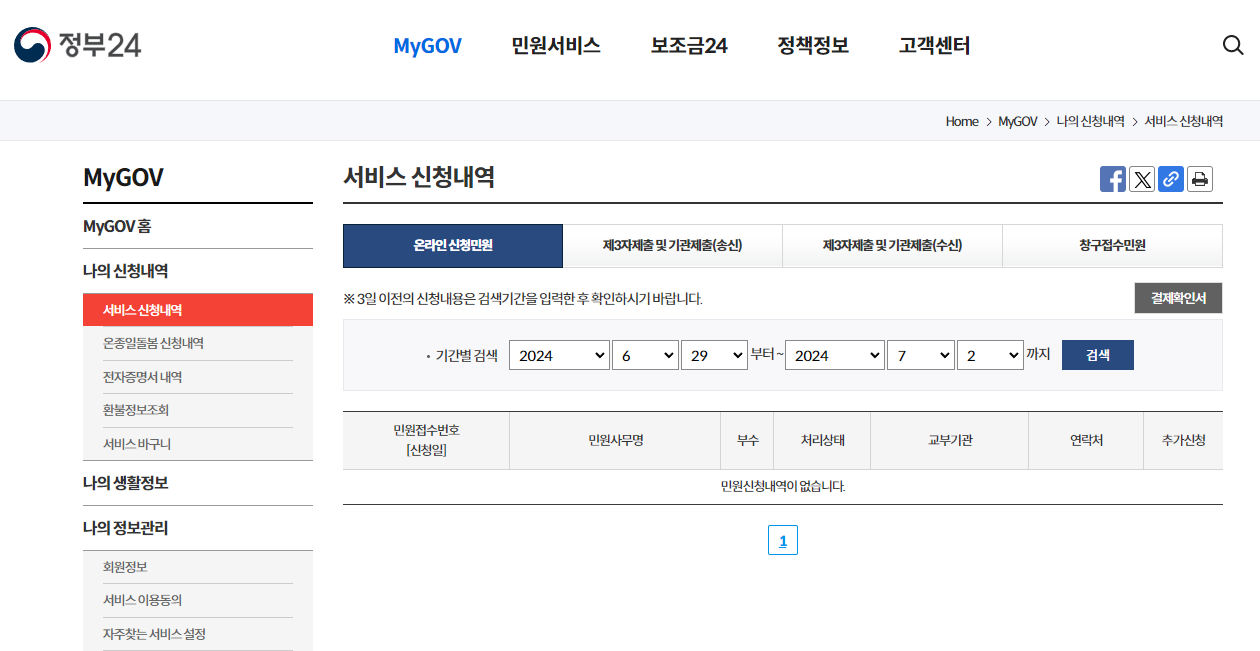 "정부 24 - MyGOV-서비스신청내역"에서 지정가능합니다.