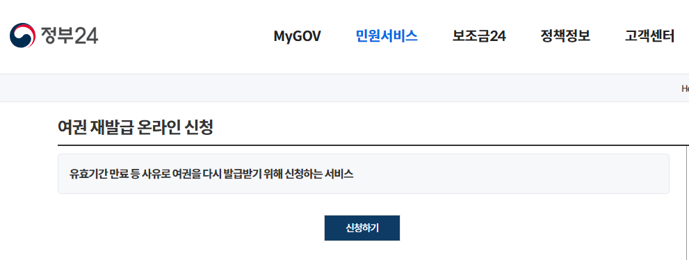 또한 여권의 재발급신청은 온라인 정부민원홈페이지를 이용하시면 집 밖으로 나가지 않고 편리하게 신청할 수 있습니다.