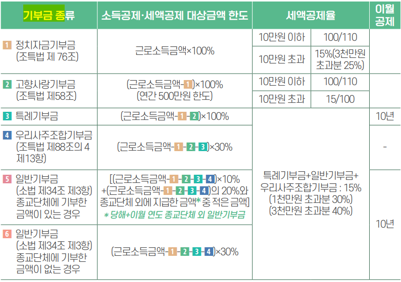 조세특례제한법에 따른 정치자금기부금, 고향사랑기부금, 우리사주조합기부금은 이월공제가 허용되지 않습니다.