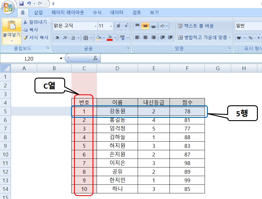 스프레드 시트의 세로줄을 '열' 이라고 하고, 가로줄을 '행'이라고 합니다. (아래 사진 참조)