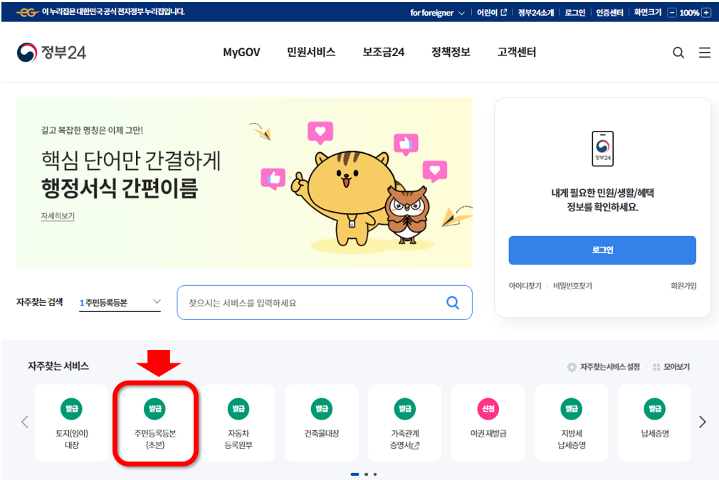자주찾는 서비스의 주민등록등본 발급 버튼을 눌러서 진행합니다.