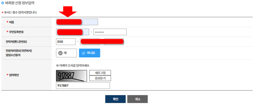 그 아래에 필수정보를 기입하고 확인단추를 눌러줍니다.