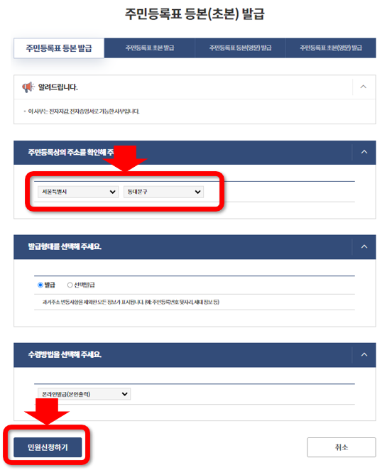 주민등록상의 주소를 선택하고 민원신청하기 버튼을 눌러줍니다.