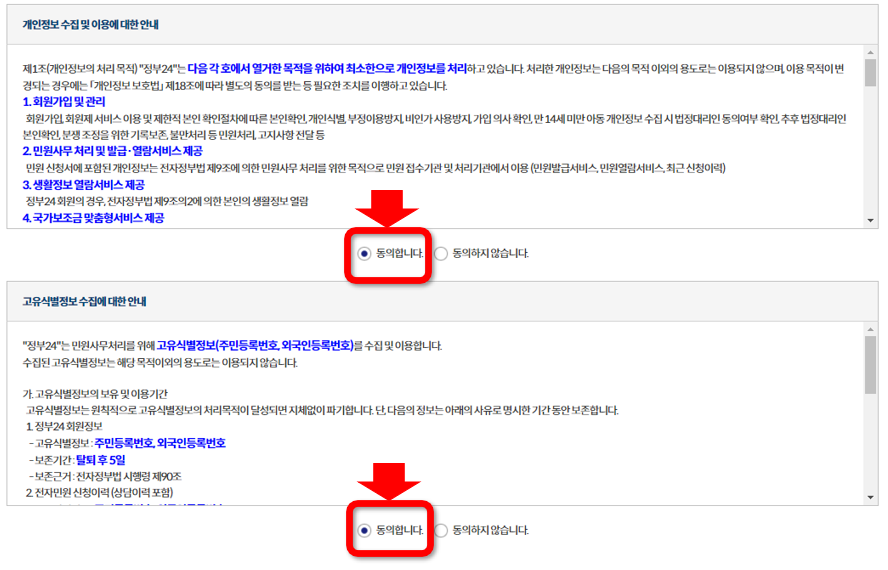 개인정보 수집/이용 안내 및 고유식별정보 수집 안내에 동의를 선택합니다.