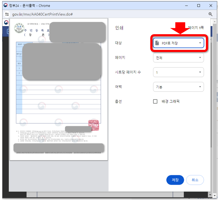 아래 그림에서 대상에 프린터 대신 PDF파일을 선택하고, 저장위치를 지정하여 저장하면 됩니다.