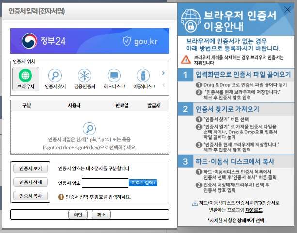 인증서를 선택하고, 비밀번호를 기입하고 확인을 누르면 됩니다.