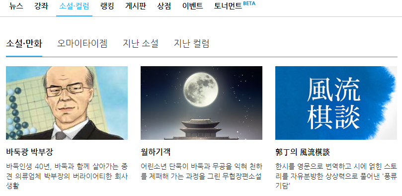 바둑이야기를 기반으로 한 다양한 소설, 만화, 칼럼을 이용할 수 있습니다.