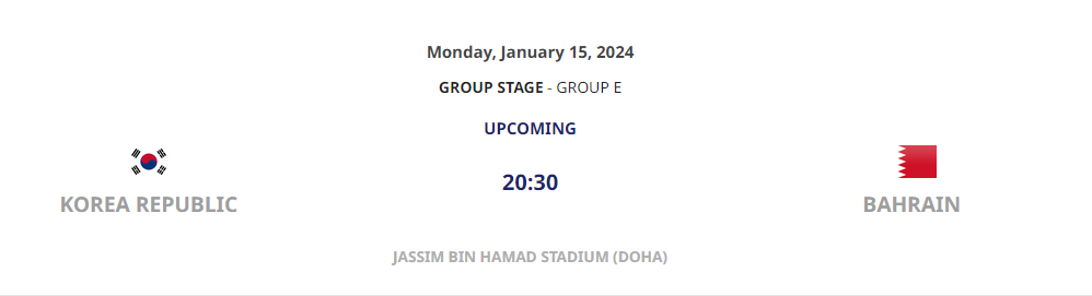 - 1차전 (1월 15일, 현지시간 14:30시, 한국시간 20:30시 ) : 대한민국 - 바레인