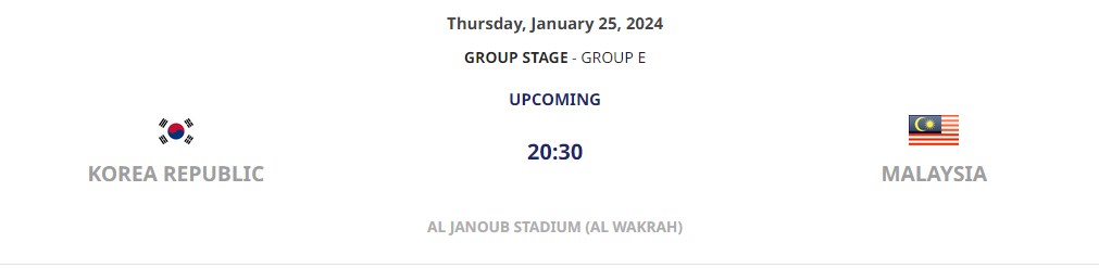 - 3차전 (1월 25일, 현지시간 14:30시, 한국시간 20:30시) : 대한민국 - 말레이시아