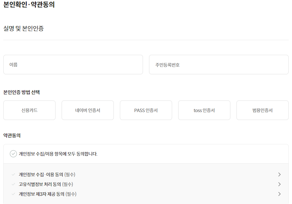 다음으로 넘어가면 본인확인/약관동의 페이지가 나옵니다. 인증방법을 선택하시어 진행하시면 됩니다.