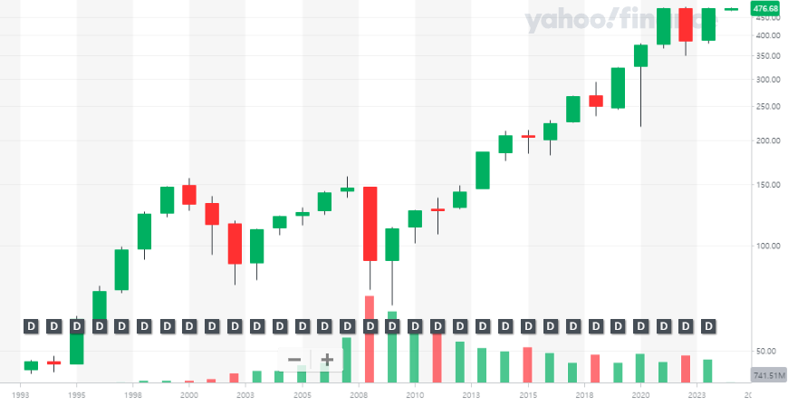 배당률은 낮습니다만 장기적으로 성장성과 실적을 담보로 SPY의 편입종목들은 매년 우상향 하는 중입니다.